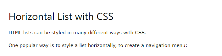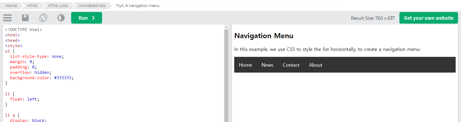 Horizontal List with CSS → Try it yourself를 클릭하면 다음과 같이 예시와 함께 예시를 적용했을 때의 출력 화면을 보여준다.