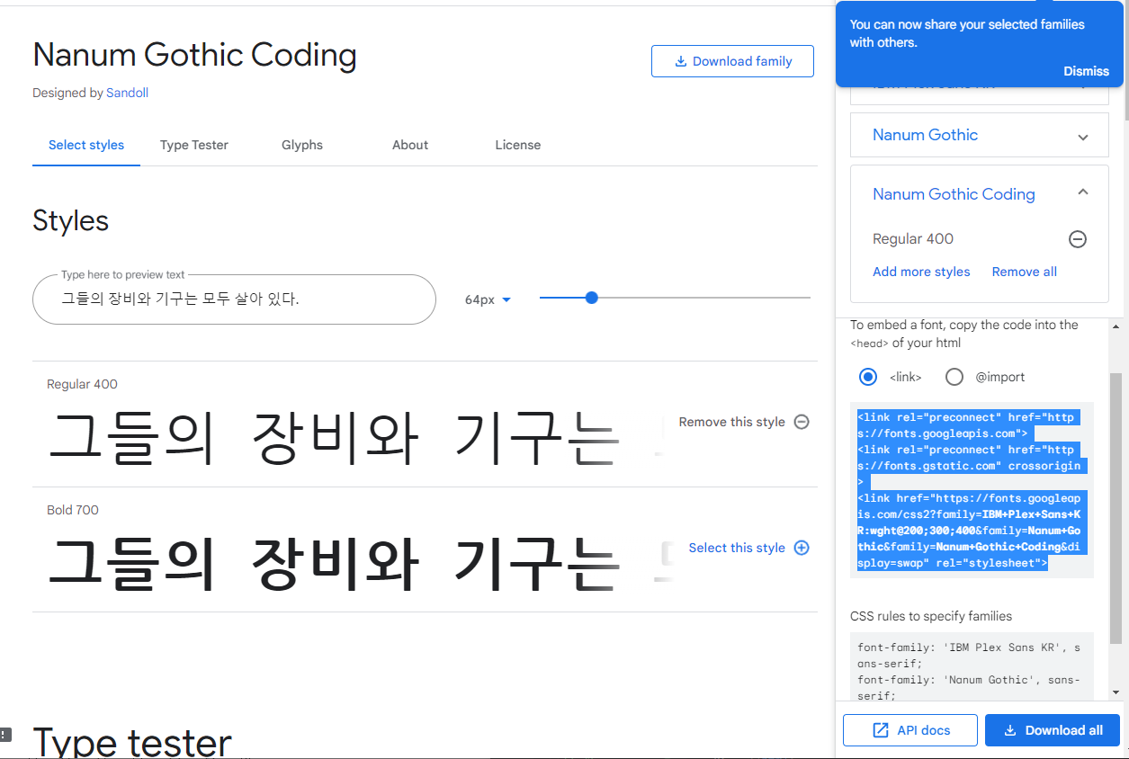 구글 폰트(www.fonts.google.com)에 들어가 원하는 한글체 link를 퍼와 html <head>에 붙여준다.