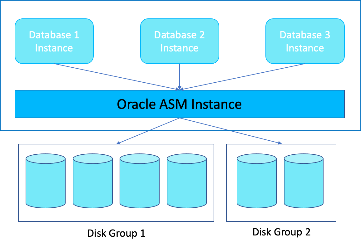 위 그림의 경우는 단일 인스턴스로 구성되어 있는 여러개의 데이터베이스들이 ASM 인스턴스를 통해 Storage에 접속해서 데이터를 관리하는 케이스다. 이 경우 Muti-instance 라고도 하는데 해당 인스턴스에 대해서는 다음 포스팅으로 add 하겠다.