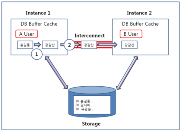 instance1에서 A user가 홍길동을 강감찬으로 update 후 commit 수행한 후 B user가 원래 홍길동이었던 deptno=10번을 조회할 경우, instance1에서 변경된 데이터를 디스크를 거치지 않고 interconnect을 통해서 즉시 instance2로 전달된다. 그러면 RAC ping현상을 없앨 수 있다.