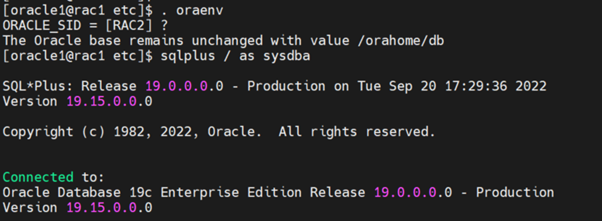 4. wq 으로 저장하고 나온 후, . oraenv를 입력한 후, sysplus / as sysdba를 입력하면 SID= RAC2로 환경변수가 변경되면서 해당 db sql로 접속하게 된다.