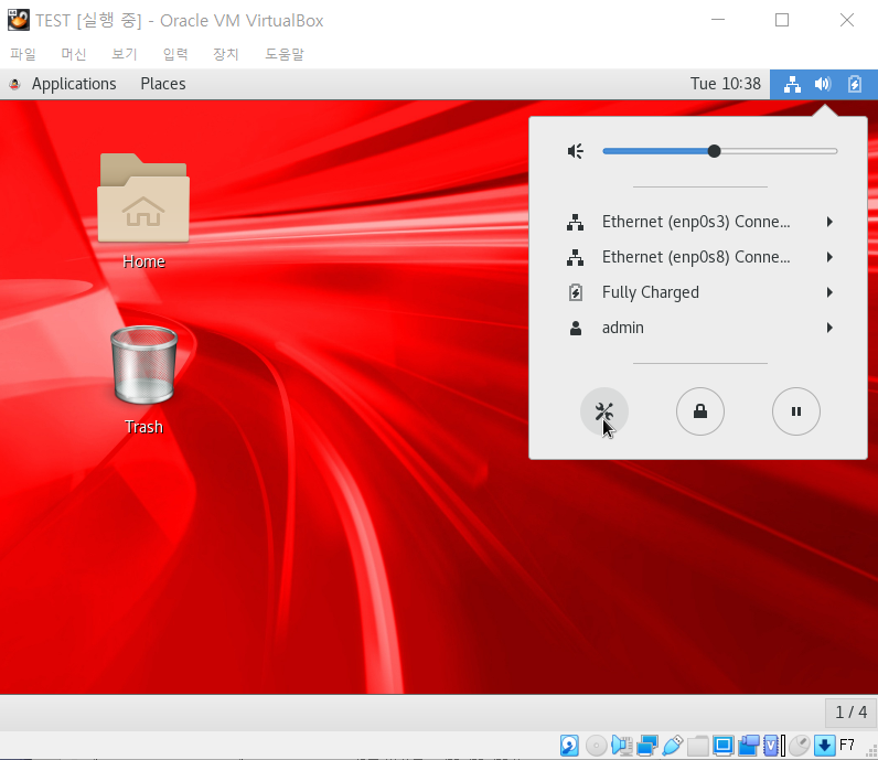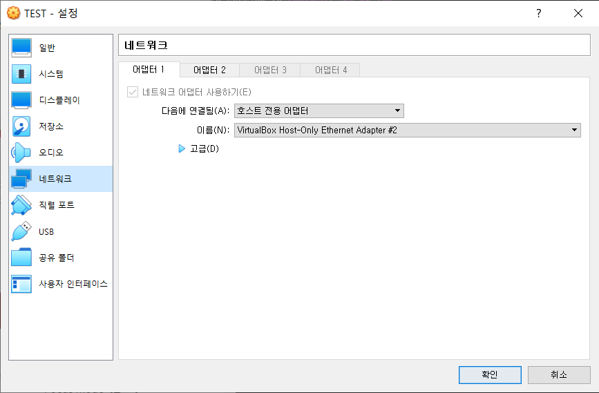 2. 해당 OS 클릭한 후 [설정] → [네트워크] → [어뎁터1]에는 호스트 전용 어댑터로 해당 Host-Only Ethernet Adapter 적용, [어뎁터2]에는 NAT 설정 후 확인 클릭 -> 설정 닫기