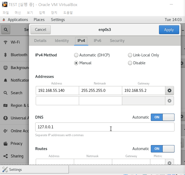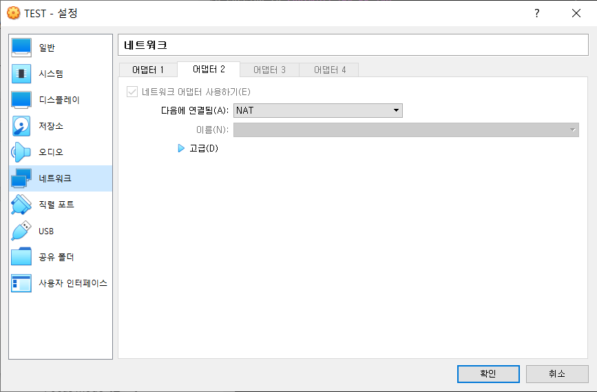 ※어뎁터2에 NAT로 설정 안했더니 static ip가 아닌 dhcp 쪽 ip로 바뀜