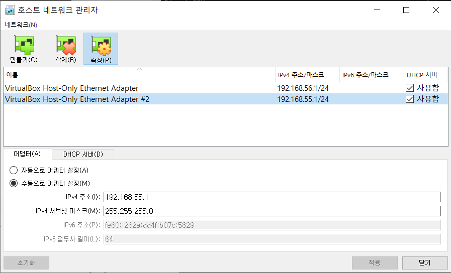 1. Virtualbox에서 [호스트 네트워크 관리자] →[ 만들기 ] → 수동으로 어댑터 설정 체크 → IPv4 (192.168.55.1) / 서브넷마스크 (255.255.255.0)으로 설정 후 적용 클릭
